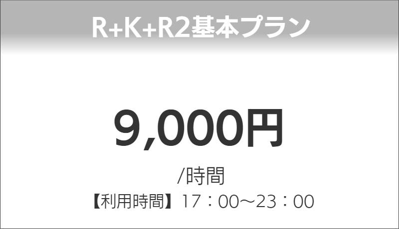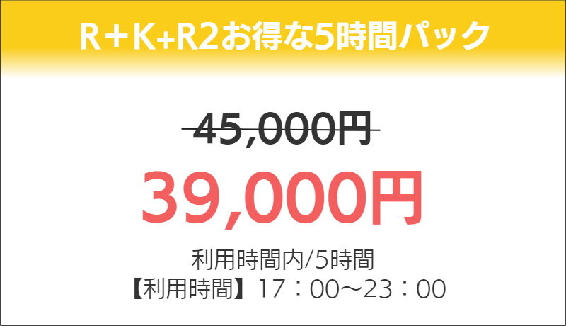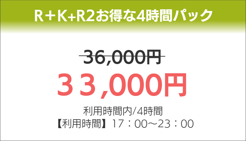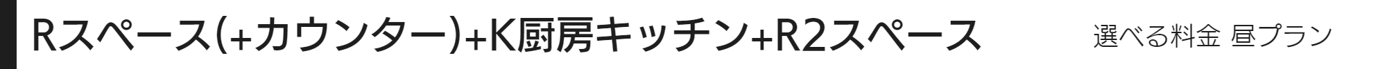 Rスペース(+カウンター)+K厨房キッチン +R2スペース 人数40人以内 |