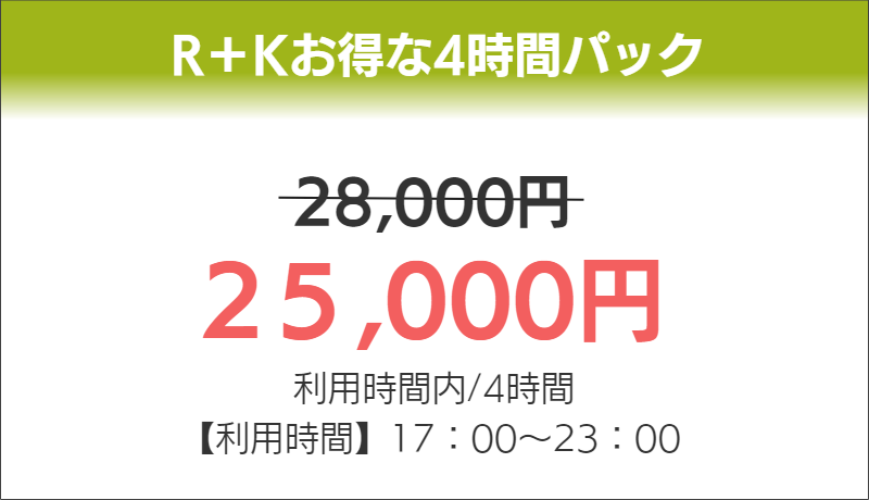 Rスペース(+カウンター)+K厨房キッチン 人数25人以下 |