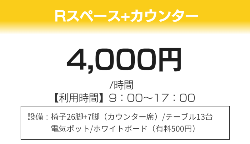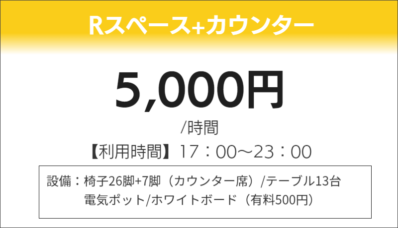 | 設備:椅子26脚・7脚(カウンター席)/テーブル台/電気ポット/電気ケトル/ホワイトボード(有料500円) | |