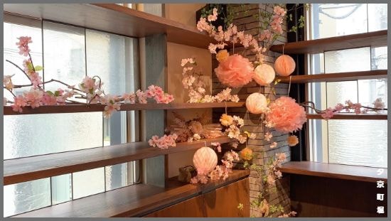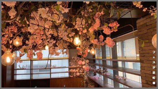 天井からは、本物の桜の枝と造花の桜のミックスで装飾してます